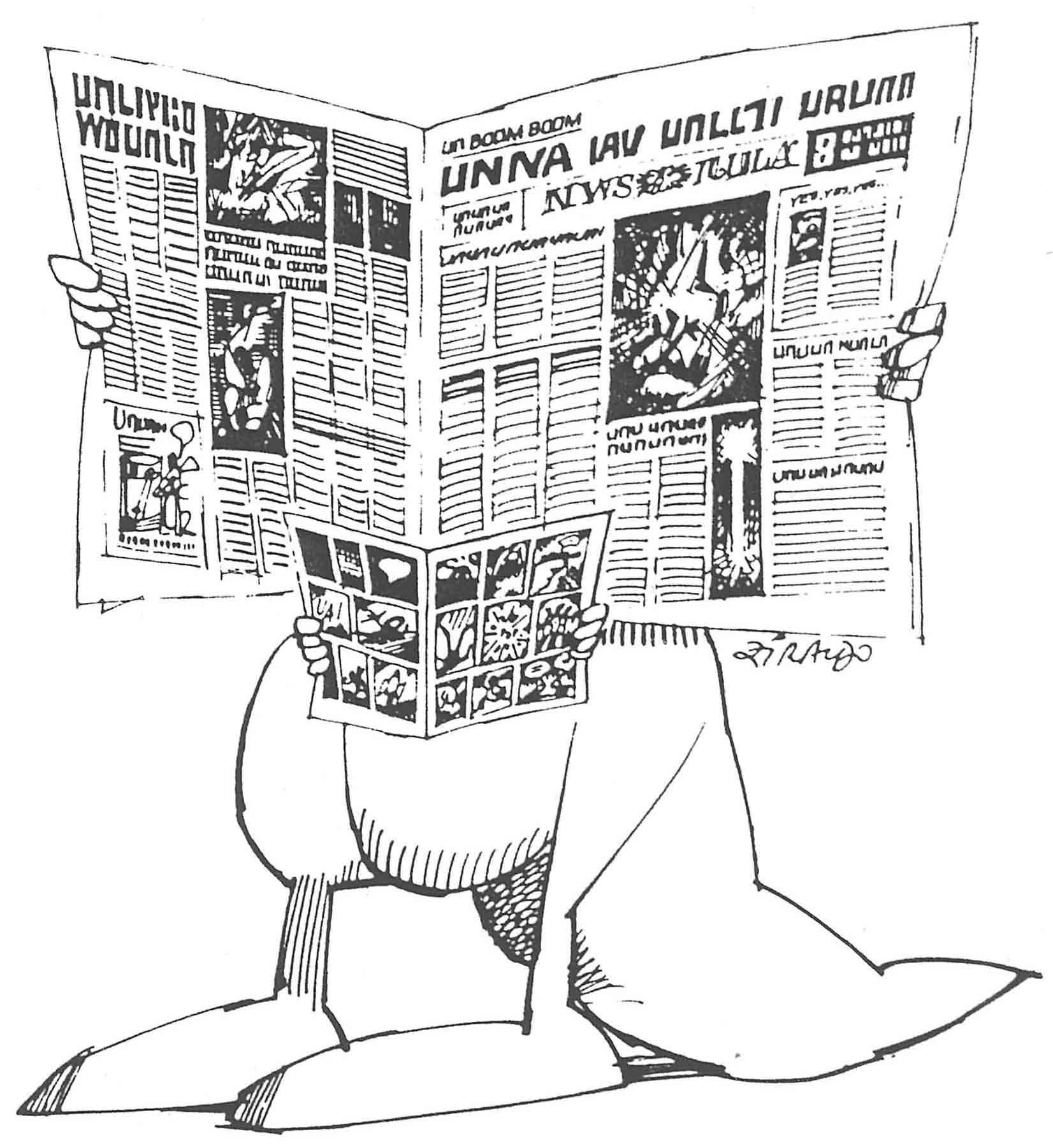 [Canguru lendo jornal, filhote lendo gibi]