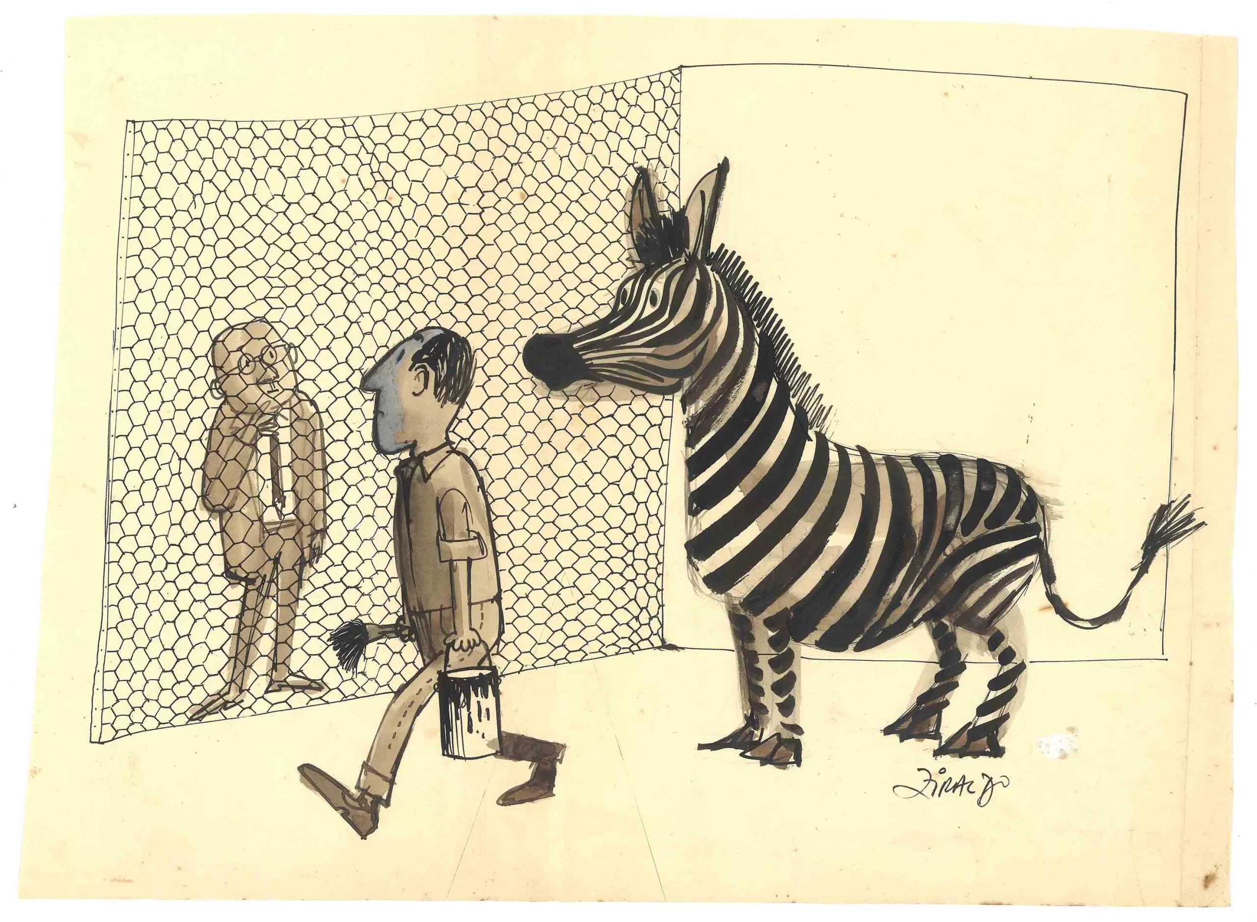 [Homem observando outro homem com balde de tinta pintando uma zebra]